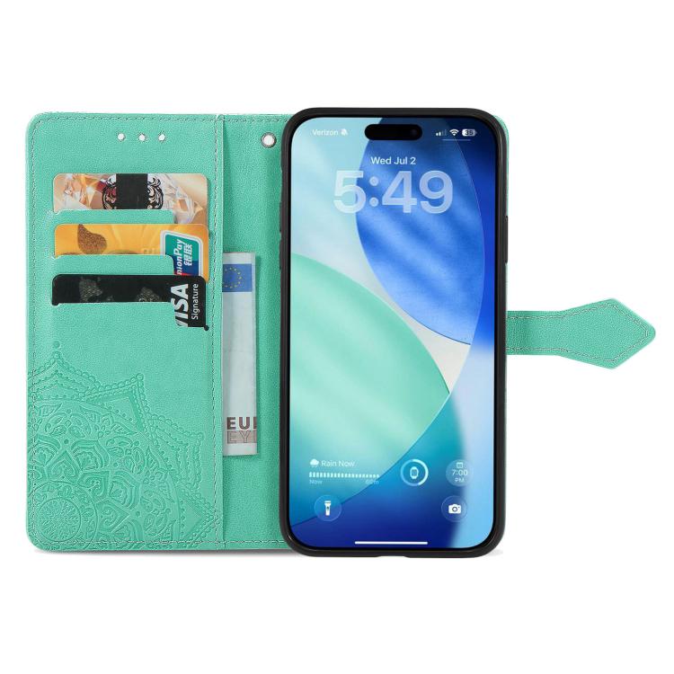 Funda de cuero con relieve de flor de mandala para iPhone 17 Pro (verde)