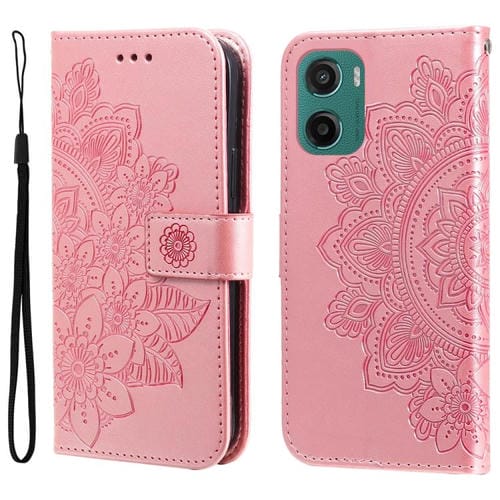 Funda de Cuero con Relieve Flores Siete Pétalos para Motorola Moto G05/E15 (Oro Rosa)