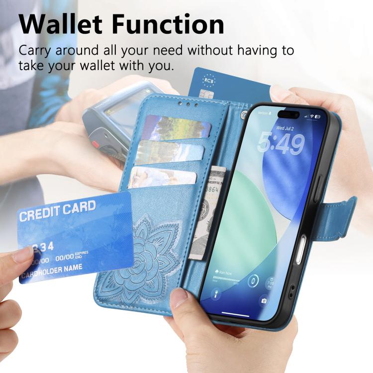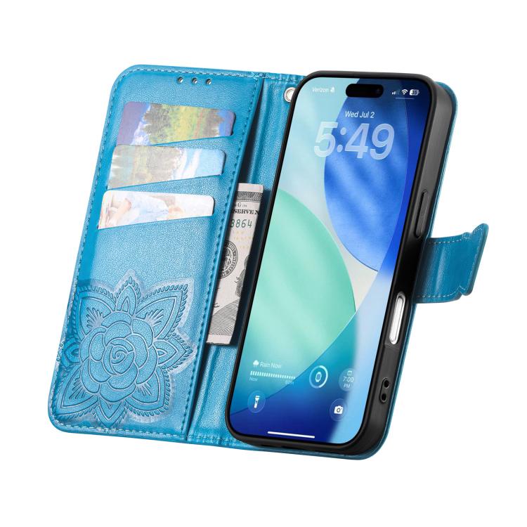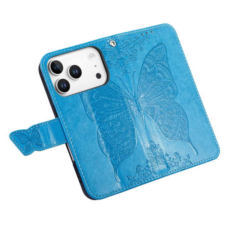 Funda de cuero con relieve de mariposa y flor para iPhone 17 Pro Max (azul)