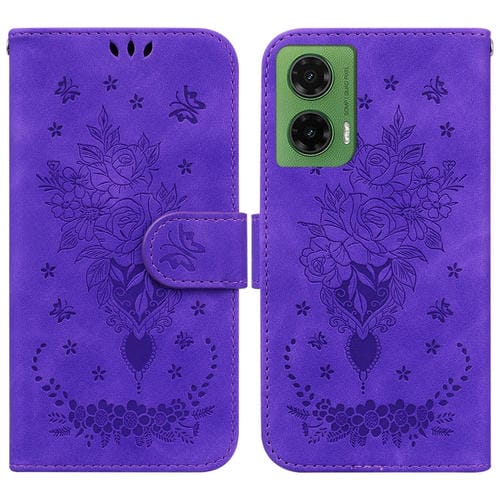 Funda de Cuero con Relieve Mariposa y Rosa para Motorola Moto G35 (Morado)