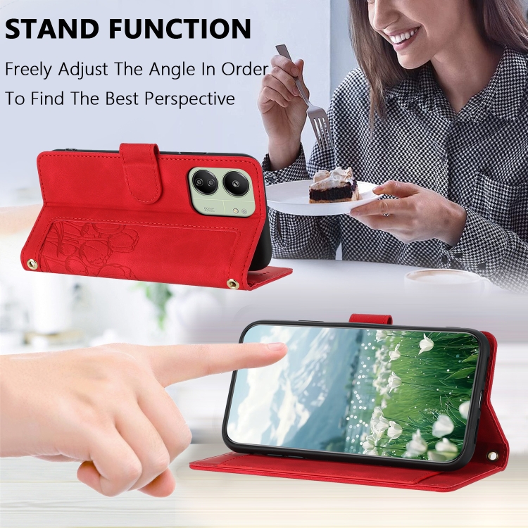 Funda de Cuero con Relieve de Tulipanes para Redmi 13C 4G/5G con Cordón (Rojo)