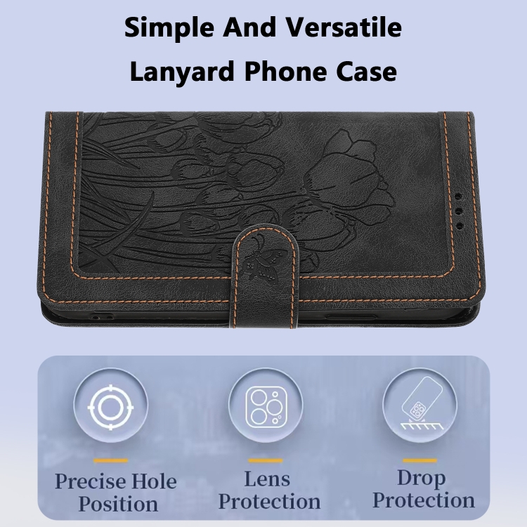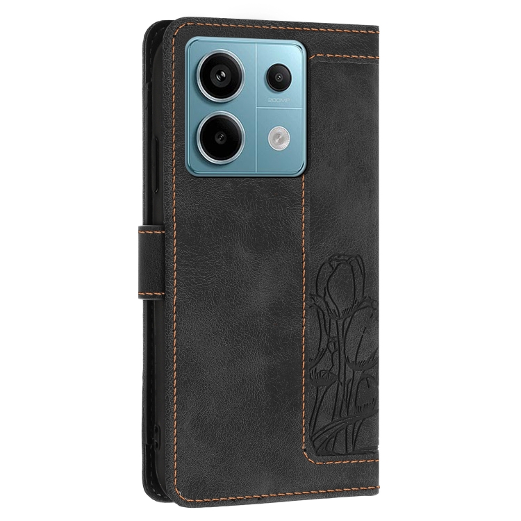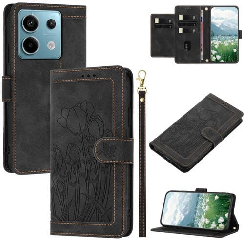 Funda de Cuero con Relieve de Tulipanes para Redmi Note 13 5G con Cordón (Negro)