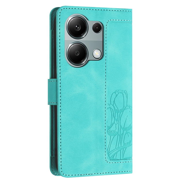 Funda de Cuero con Relieve de Tulipanes para Redmi Note 13 Pro 5G con Cordón (Verde)