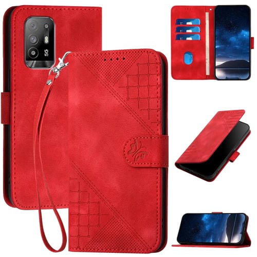 Funda de Cuero con Tapa y Cordón para Oppo Reno5 Lite Yx0080 con Diseño En Relieve de Mariposa y Cuadrícula (Rojo)