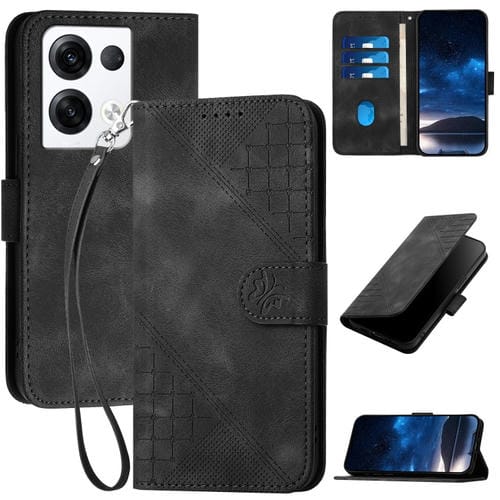 Funda de Cuero con Tapa y Cordón para Oppo Reno8 Pro 5G Global Yx0080 con Diseño En Relieve de Mariposa y Cuadrícula (Negro)