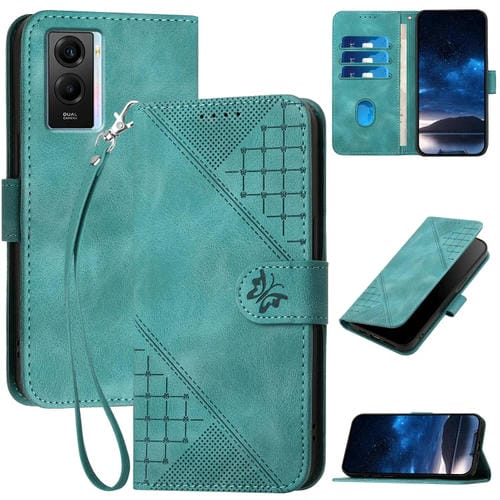 Funda de Cuero con Tapa y Cordón para Vivo Y75 5G Global Yx0080 con Diseño En Relieve de Mariposa y Cuadrícula (Azul Claro)