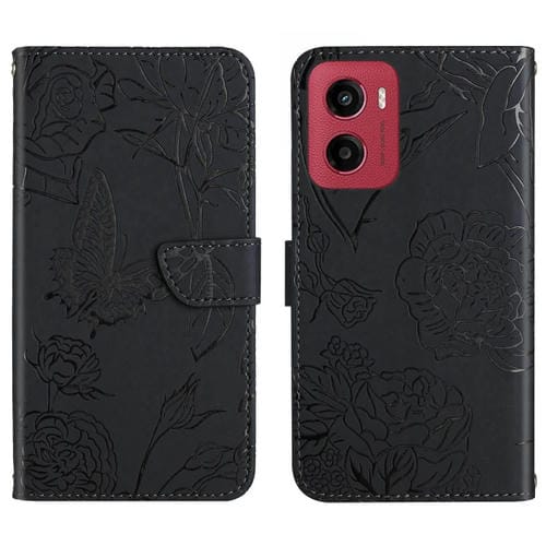 Funda de Cuero con Tapa y Mariposas en Relieve para Motorola Moto G05 Ht03 (Negra)