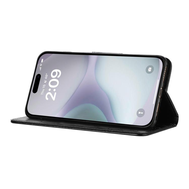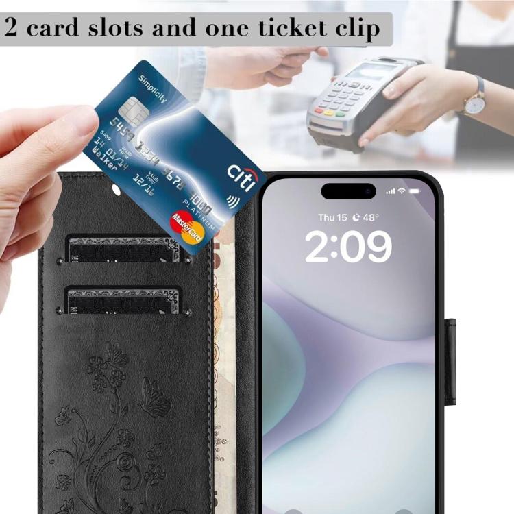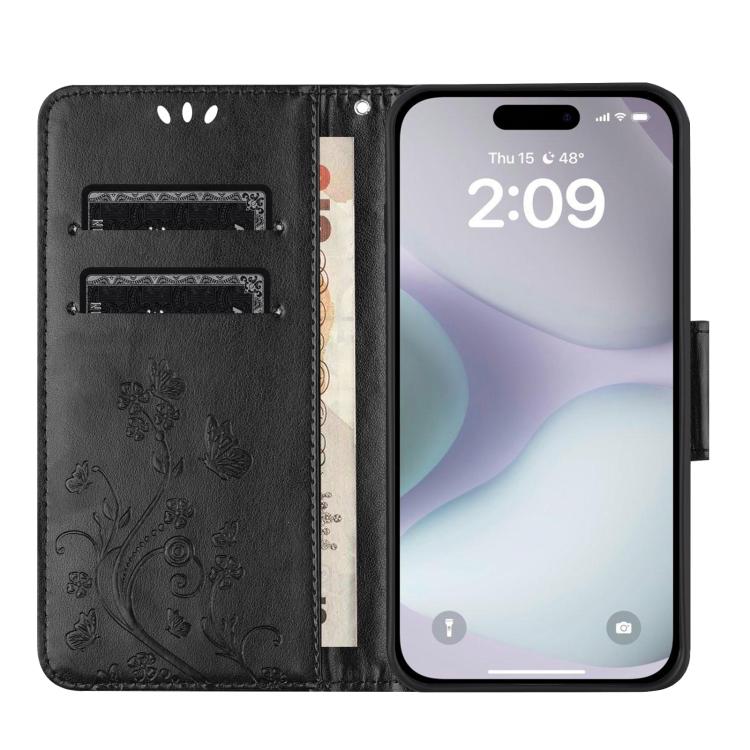 Funda de cuero con tapa y diseño de mariposas y flores para iPhone 17 (negra)
