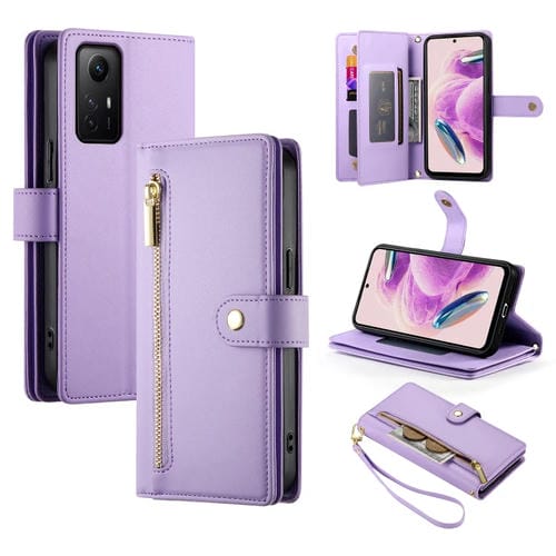 Funda de Cuero para Teléfono con Nueve Ranuras para Tarjetas y Cremallera para Redmi Note 12S 4G/Note 11 4G (Morado)