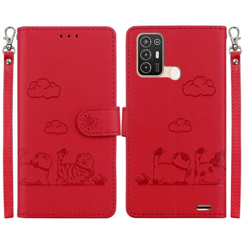 Funda de Cuero Rfid para ZTE Blade A52 con Diseño de Gatos (Rojo)