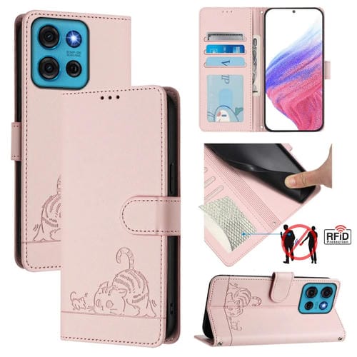 Funda de Cuero Rfid para Motorola Moto G75 con Estampado de Rata y Gato en Relieve y Cordón (Rosa)