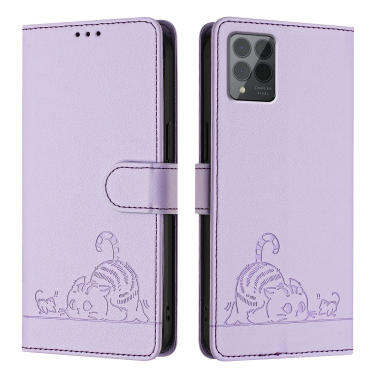 Funda de Cuero Rfid con Relieve de Rata de Gato para T-Mobile Revvl 6 Pro / 6X Pro con Cordón (Morado)