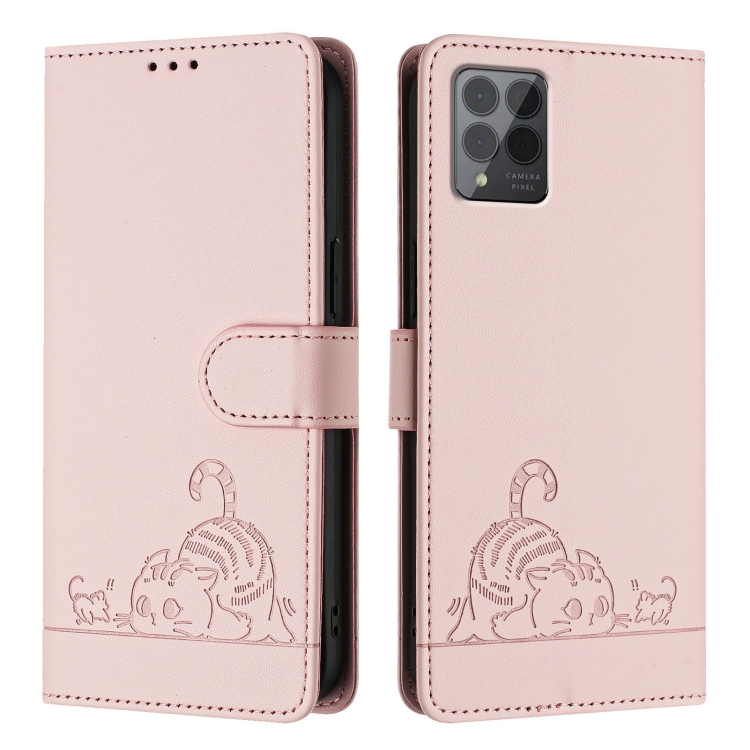 Funda de Cuero Rfid con Relieve de Rata de Gato para T-Mobile Revvl 6 Pro / 6X Pro con Cordón (Rosa)