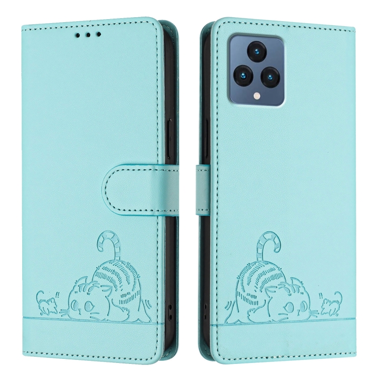 Funda de Cuero Rfid con Relieve de Rata de Gato para T-Mobile Revvl 6/6X 5G con Cordón (Verde Menta)