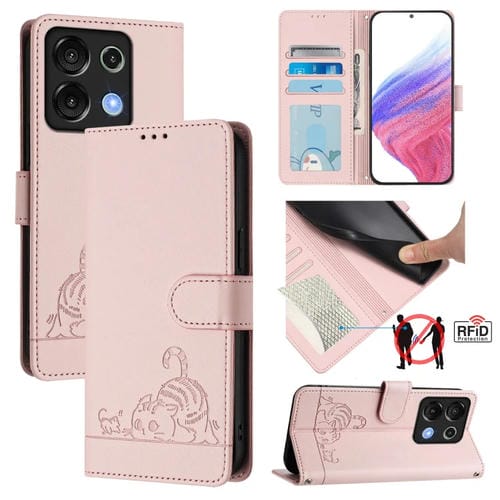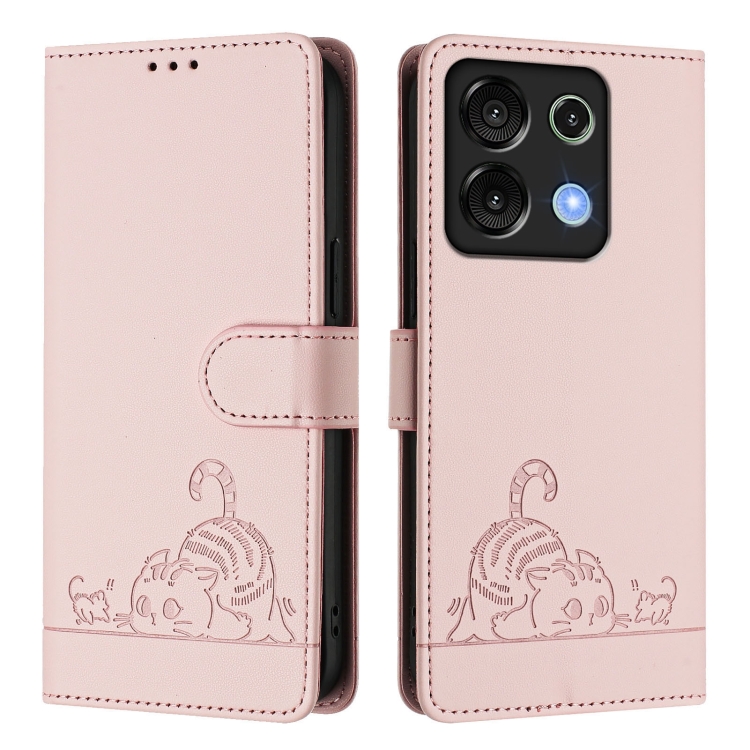 Funda de Cuero Rfid para Umidigi G9 5G con Relieve de Rata y Gato y Cordón (Rosa)
