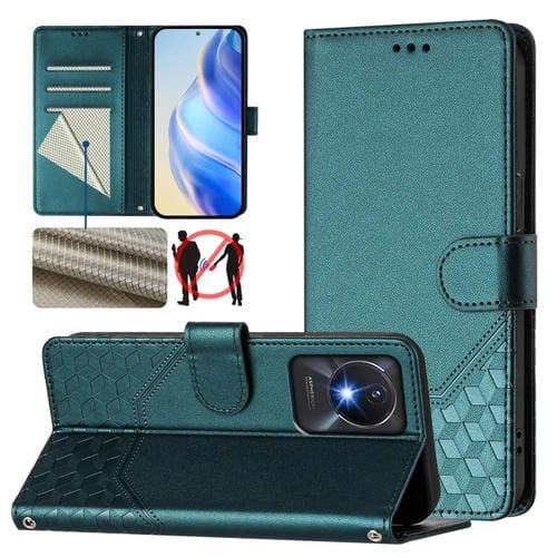 Funda de Cuero Rfid con Relieve En Panal para Vivo Y02A 4G / Y02 4G / Y11 2023 / Y02T (Verde Pavo Real)