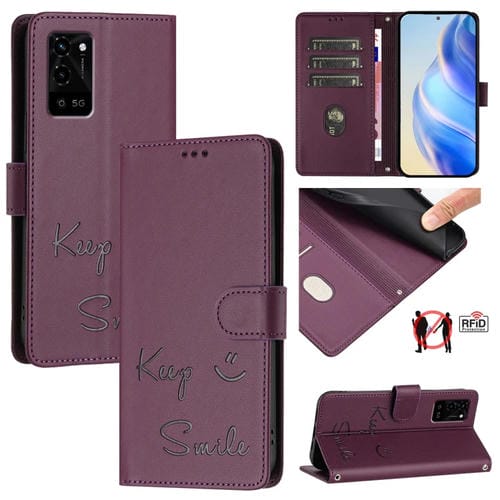 Funda de Cuero Rfid con Relieve Sonriente para Oppo A16/A16S/A55S 5G (Violeta)