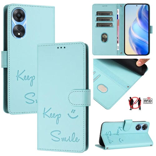 Funda de Cuero Rfid con Relieve Sonriente para Oppo A78 5G Global/A1X 5G (Verde Menta)