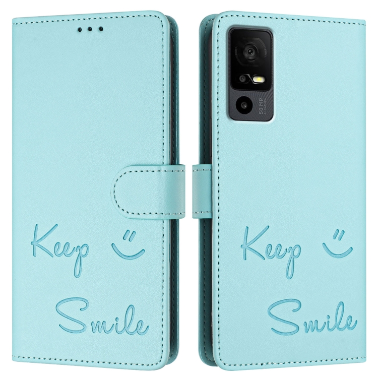 Funda de Cuero Rfid con Relieve Sonriente para TCL 40 R 5G (Verde Menta)