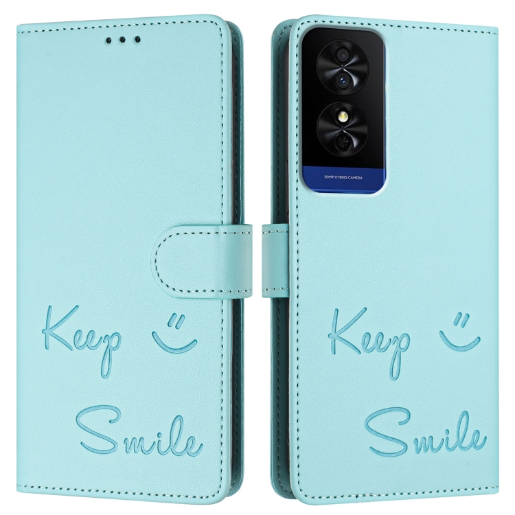 Funda de Cuero Rfid con Relieve Sonriente para Teléfono TCL 50 5G (Verde Menta)