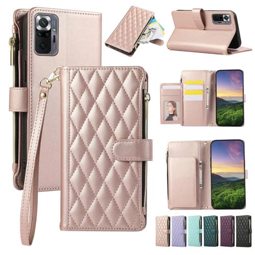 Funda de Cuero Tipo Billetera con Cremallera Rombal para Redmi Note 10 Pro/10 Pro Max (Oro Rosa)