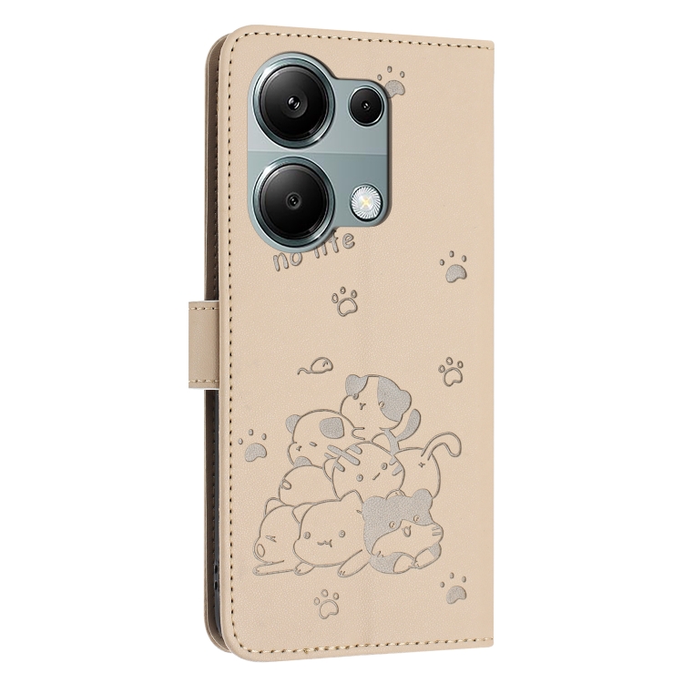 Funda de Piel con Diseño de Gatito En Relieve y Cordón para Xiaomi Poco M6 Pro 4G (Beige)