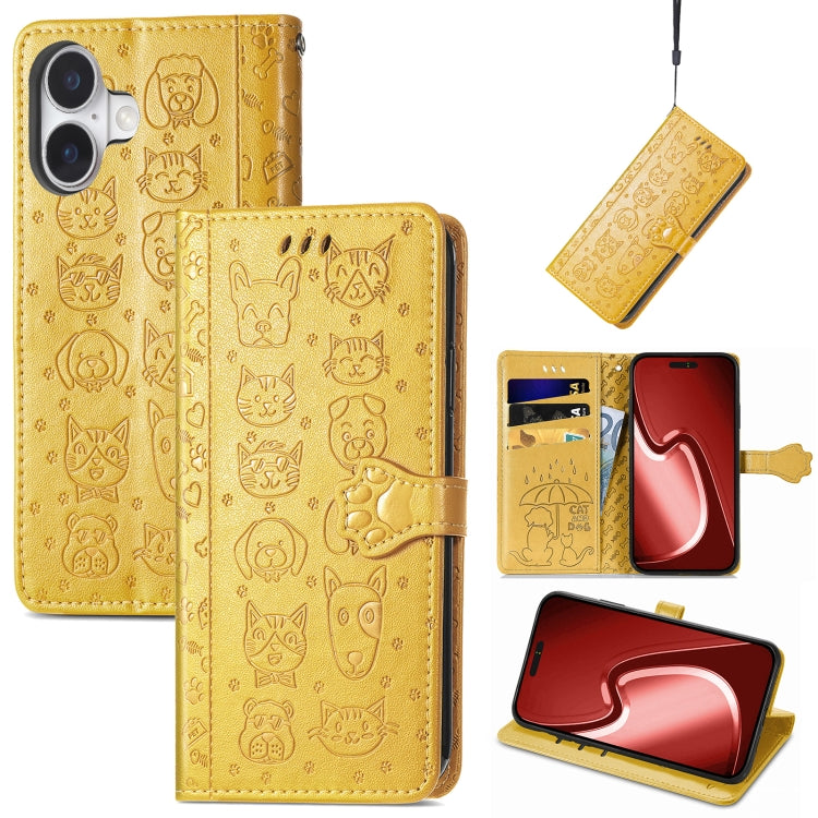 Funda de Piel con Relieve de Gato y Perro para iPhone 16 (Amarilla)