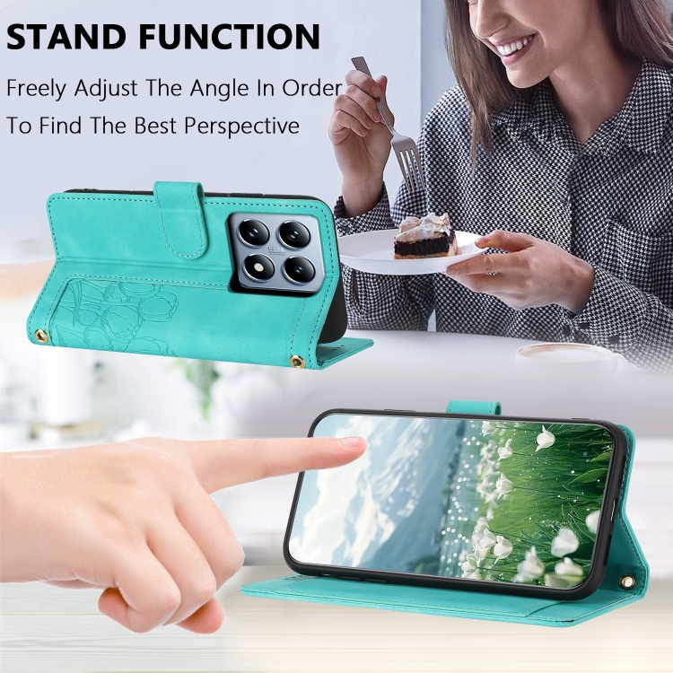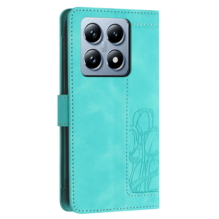 Funda de Piel con Relieve de Tulipanes para Xiaomi 14T Pro con Cordón (Verde)