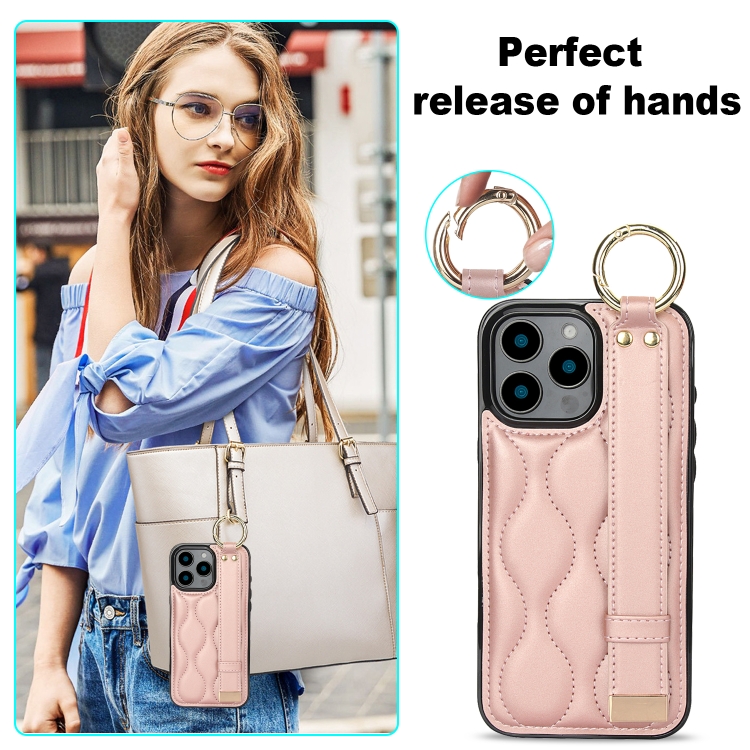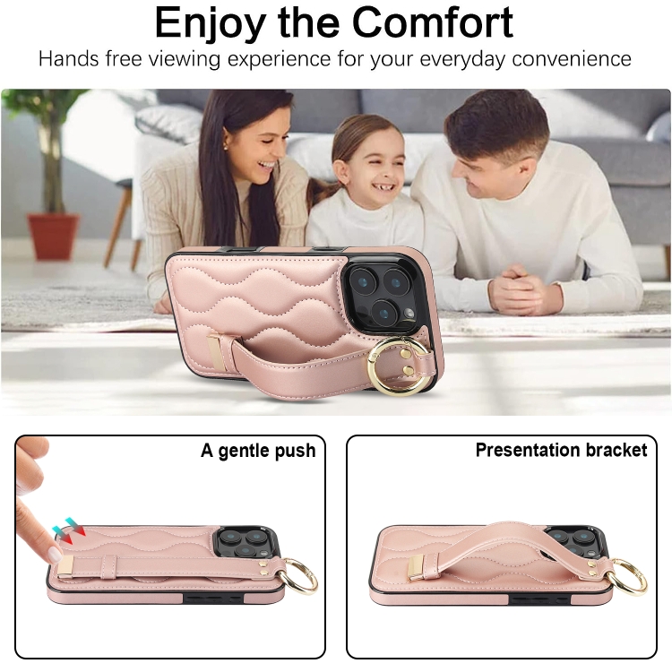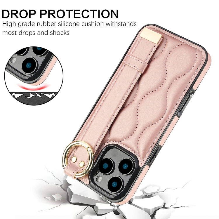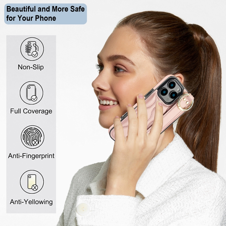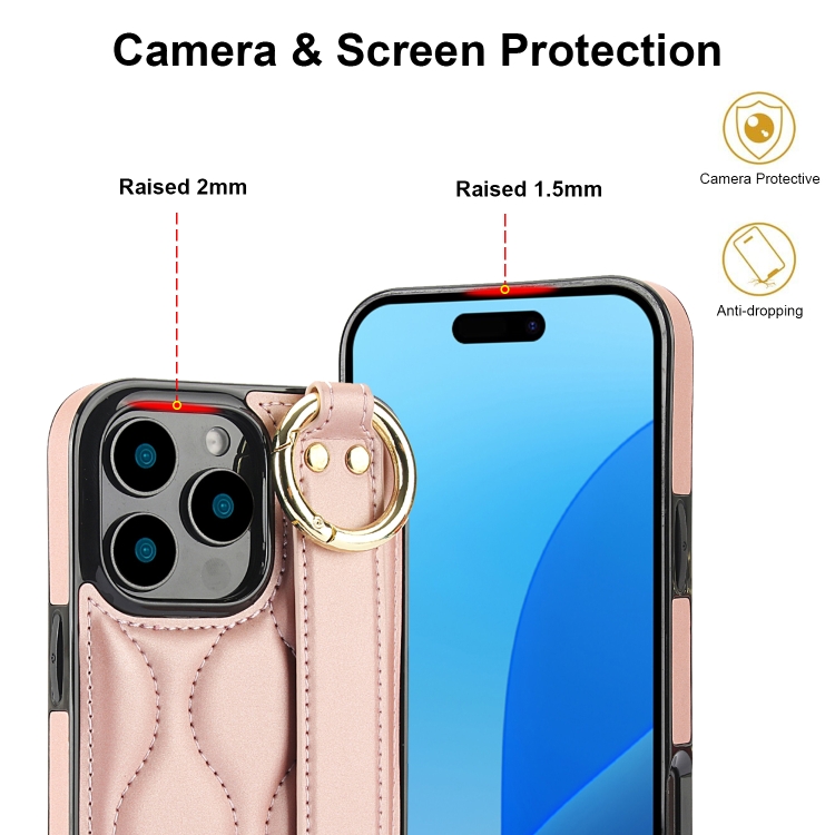 Funda de teléfono PU con anillo cobertura total antideslizante iPhone 16 Pro Max con pulsera (Oro Rosa)
