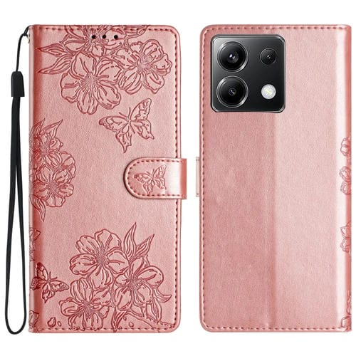 Funda de Teléfono de Pu con Relieve de Piel de Mariposa y Flor de Cerezo para Xiaomi Poco X6 (Oro Rosa)