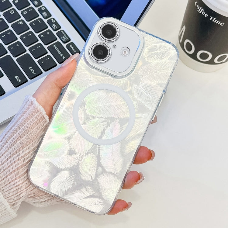 Funda de Teléfono TPU Magsafe iPhone 16 Textura Enchapada Película Lente Brillo (Plumas Blancas)