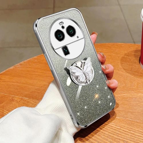 Funda de TPU con Soporte para Mariposa con Purpurina Degradada Plateada para Oppo Find X6 Pro (Plateada)