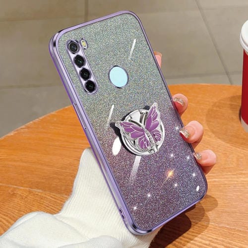 Funda de TPU para Teléfono con Soporte de Mariposa con Purpurina Degradada Plateada para Redmi Note 8 (Morado)