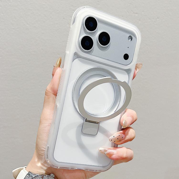 Funda MagSafe para iPhone 17 Pro con borde translúcido y soporte metálico (blanca)