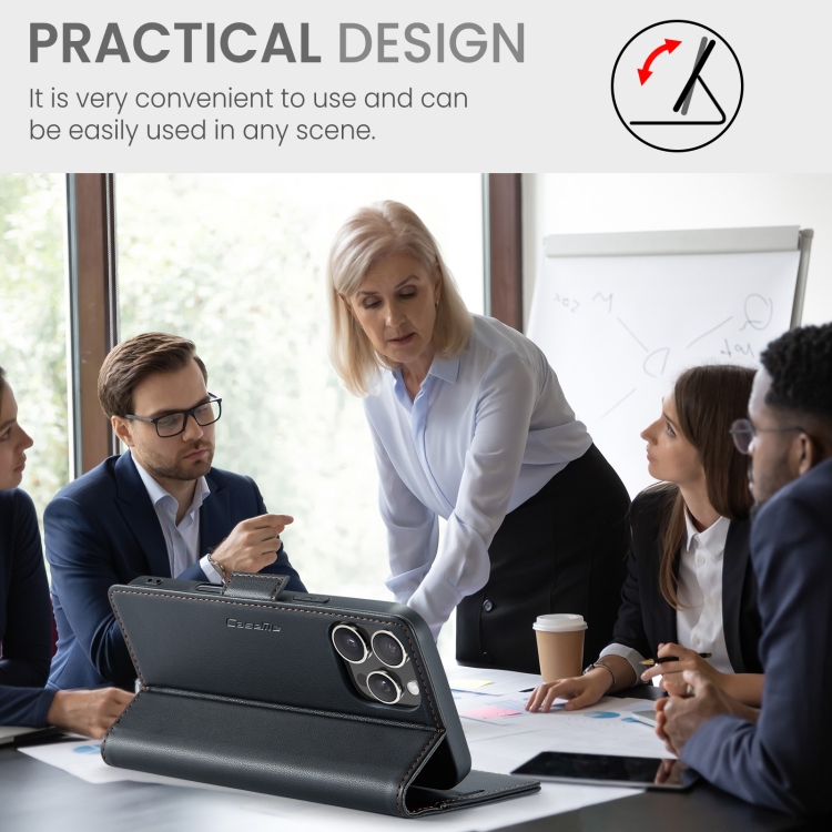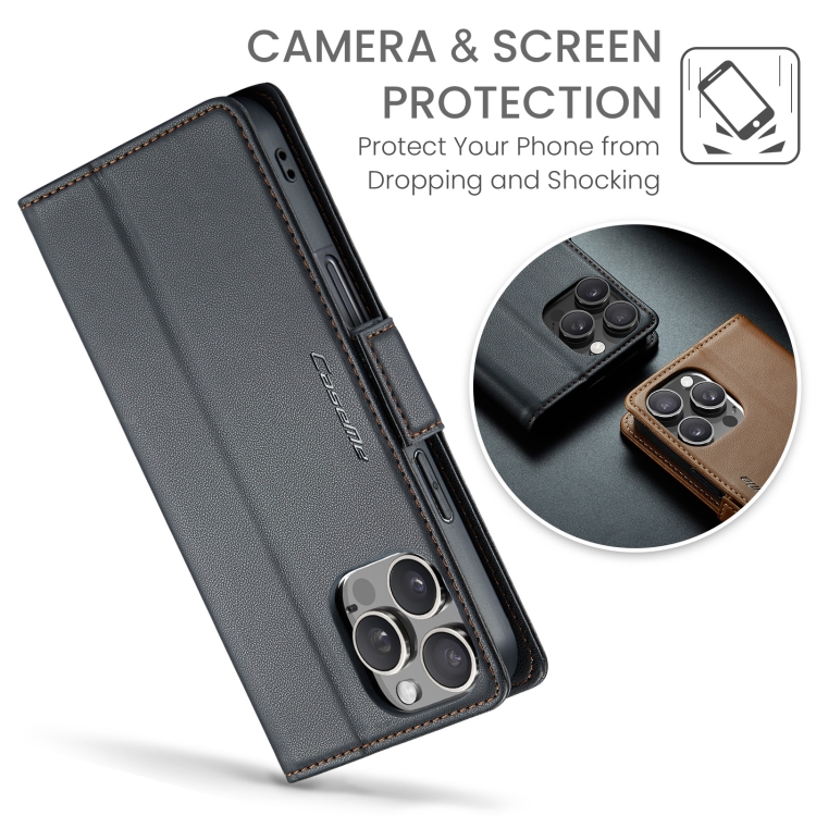 Funda para iPhone 16 Pro Max Caseme 023 con Hebilla de Mariposa Textura de Lichi Antirrobo Rfid (Negro)