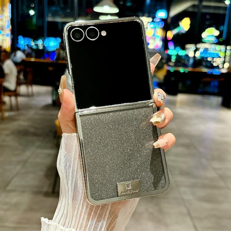 Funda para Samsung Galaxy Z Flip7 5G con marco chapado, placa de identificación de papel brillante y cobertura total (negra)