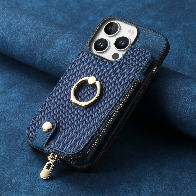 Funda para Teléfono Cuero iPhone 16 Pro Cremallera Vertical Anillo Cruzado (Azul)