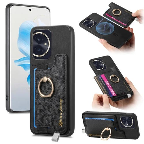 Funda para Teléfono Honor 100 con Tarjetero y Anillo de Cuero Retro Magsafe (Negro)
