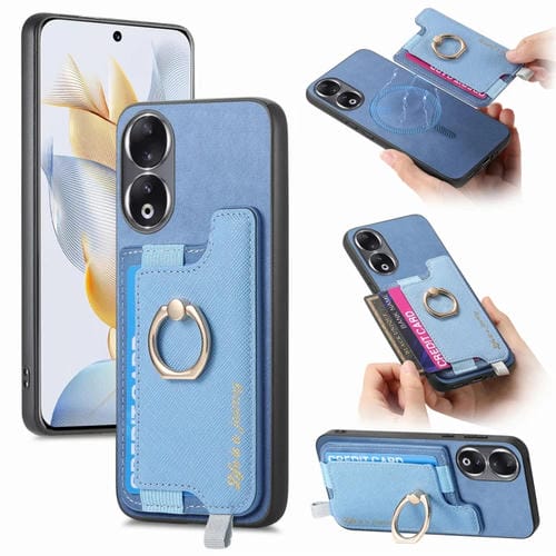 Funda para Teléfono Honor 90 con Tarjetero y Anillo de Cuero Diseño Retro Magsafe (Azul)