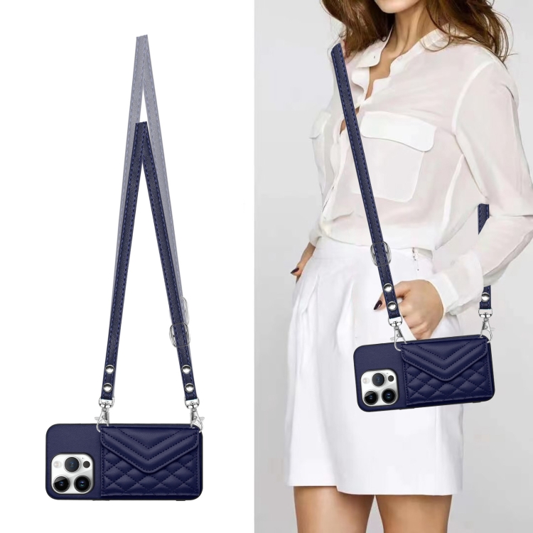 Funda para Teléfono iPhone 16 Pro Textura Rómbica con Tarjetero RFID y Cordón Largo (Azul)