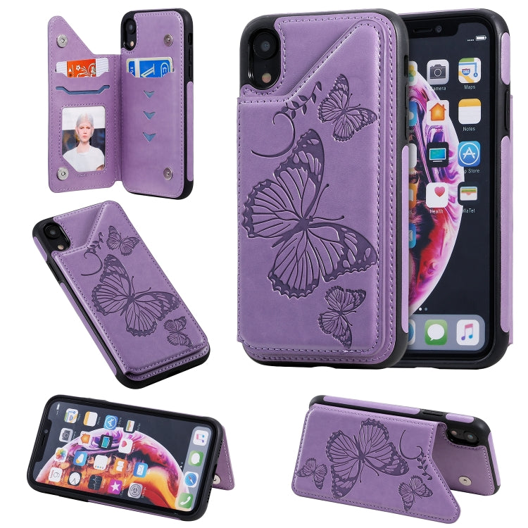 Étui de protection antichoc à motif de gaufrage papillon pour iPhone XR avec support, emplacements pour cartes et cadre photo (violet)