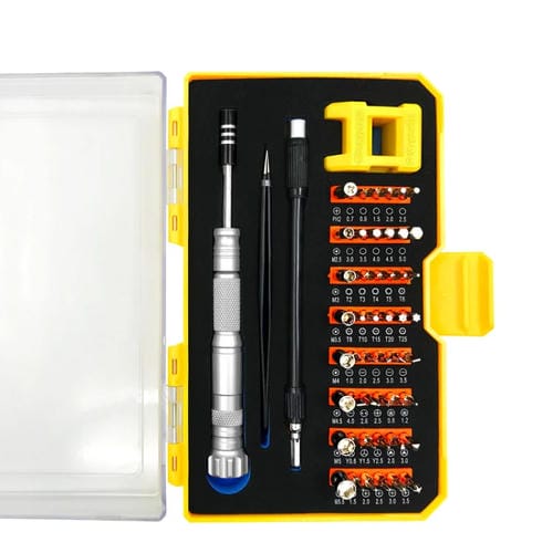El kit de destornilladores Obadun 9802B 52 en 1 es una herramienta de hardware diseñada para usuarios que reparan por cuenta propia equipos electrónicos como Teléfonos Móviles, Cámaras, cuadernos, televisores y Ventiladores eléctricos. Su manija está fabricada en aleación de aluminio con diseño antideslizante en forma de diamante, proporcionando un agarre cómodo y seguro. La barra de extensión incorpora un imán fuerte para facilitar la manipulación de los bits. Este set profesional incluye una amplia variedad de puntas de precisión, adecuadas para múltiples aplicaciones Técnicas en el hogar o en talleres especializados. Su Caja amarilla compacta (18.5x11.5x3.5 cm) facilita el almacenamiento y transporte del Conjunto.