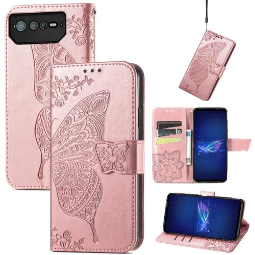 Funda de Cuero Asus Rog Phone 6 Butterfly Love Flower con Tapa en Relieve (Oro Rosa)