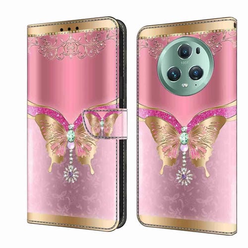 Funda Protectora de Cuero para Honor Magic5 Pro Crystal 3D a Prueba de Golpes (Mariposa Inferior Rosa)