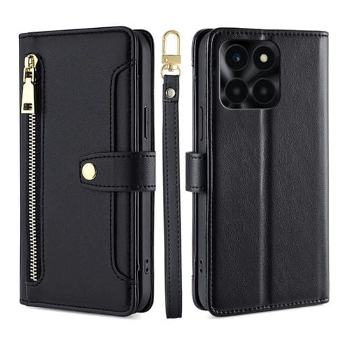 Funda de Cuero para Honor X6A 4G Lite con Billetera, Cremallera y Textura de Oveja (Negro)