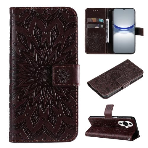 - 1x Funda de Cuero para Huawei Nova 12S con Tapa y Patrón de Girasol en Relieve (Marrón)