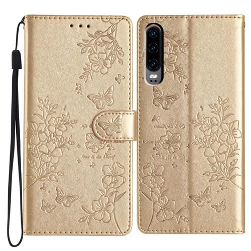 Funda de Cuero para Huawei P30 con Relieve de Flor y Mariposa (Dorado)