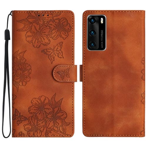 Funda para Huawei P40 Cherry Blossom Butterfly Skin Feel en PU Relieve (Marrón)