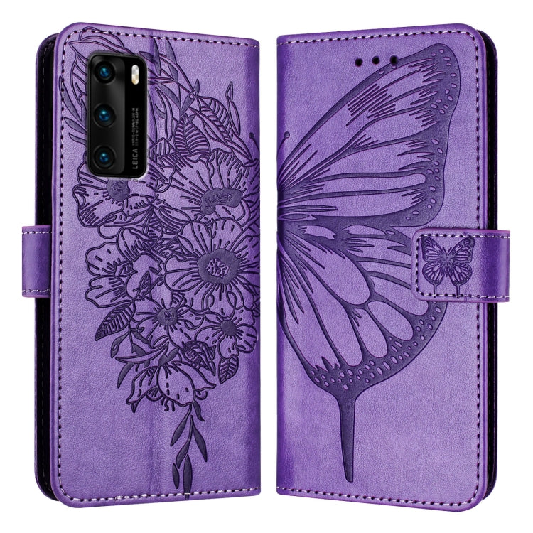 Funda de Cuero para Huawei P40 con Mariposa en Relieve (Púrpura)