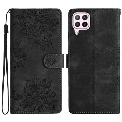 - 1x Funda para Huawei P40 Lite Cherry Blossom Butterfly Skin Feel de PU en Relieve (Negro)